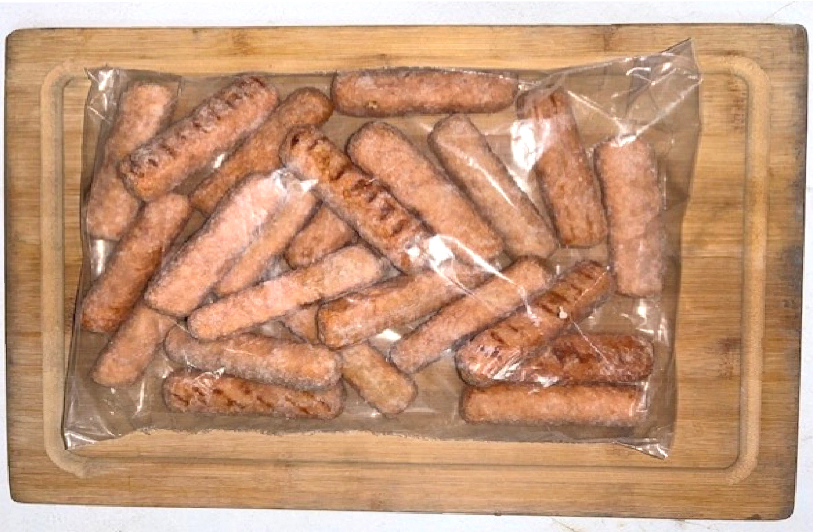 Saucisse de porc et boeuf entièrement cuites à boyau végétal, surgelées individuellement. Sac de 24 saucisses de 40 g. environ. PRODUIT DU QUÉBEC.